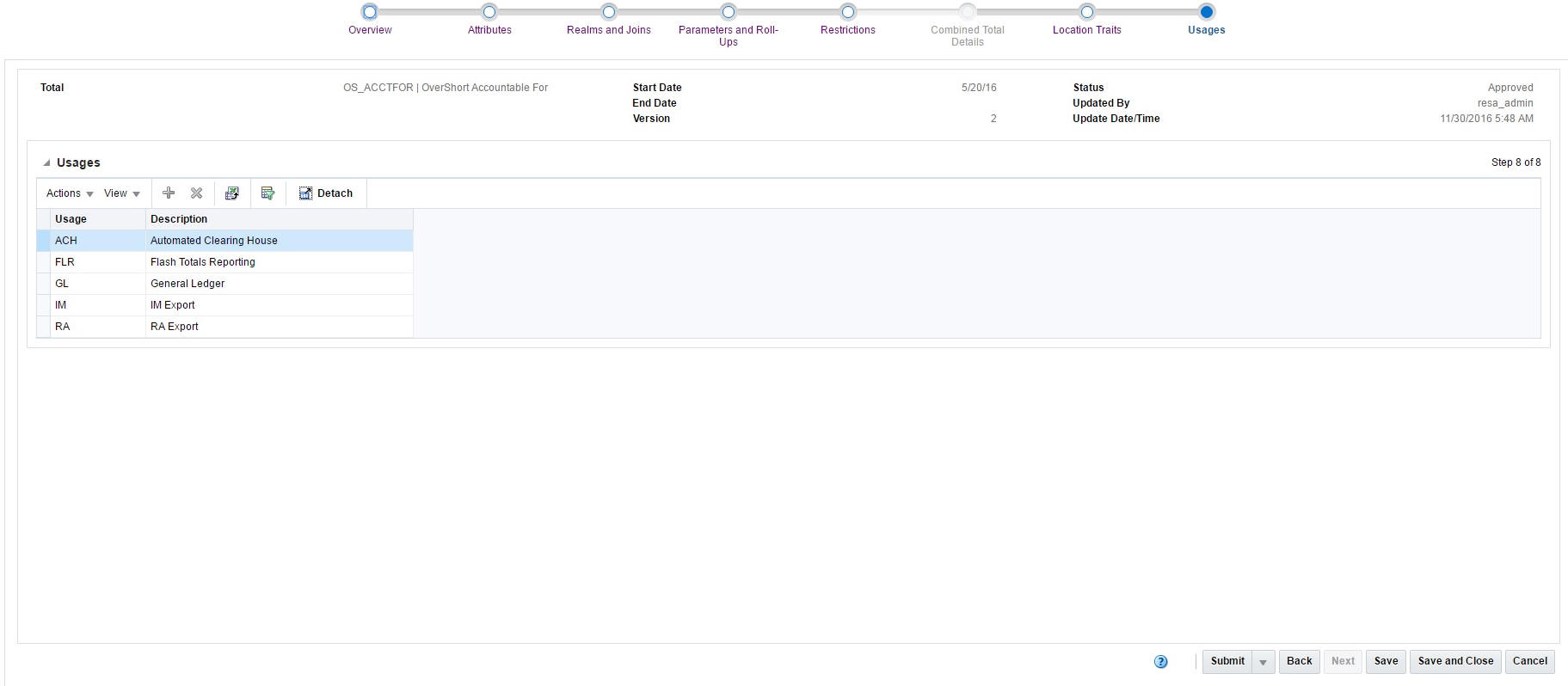 If you want to submit a total definition for approval, restrict the search to the totals in Worksheet status.From the Submit menu, select a status for the total. You can select from Submit, Approve, Disable, or Delete.