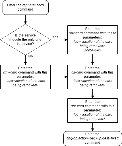 If the service module is the last service module in service, removing this card from the database will cause global title translation traffic to be lost.The examples in this procedure are used to remove the service module in card location 1204.
