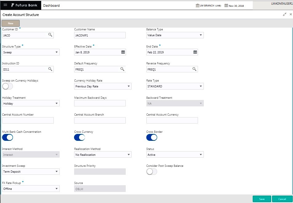 Investment sweep type should be selected as TD(term deposits) or MM (Money Market) at structure level.