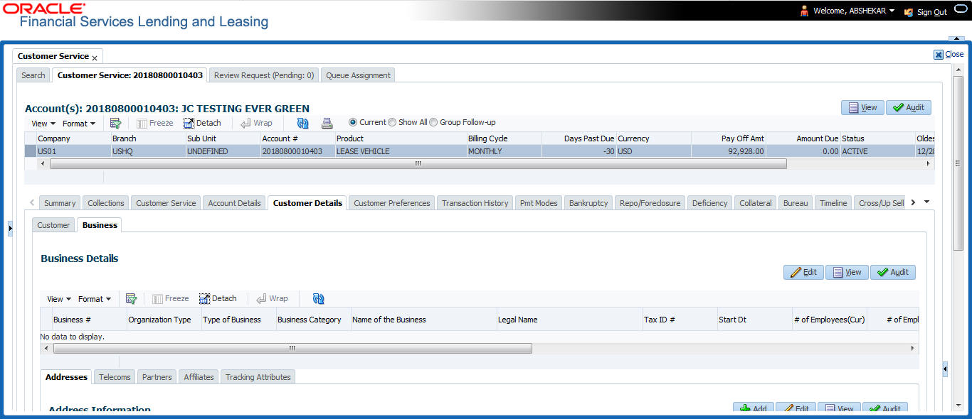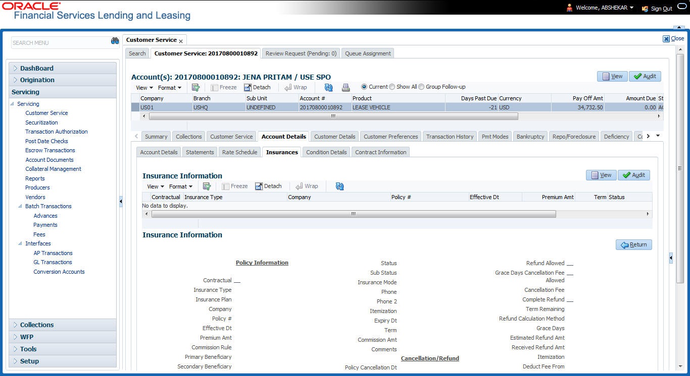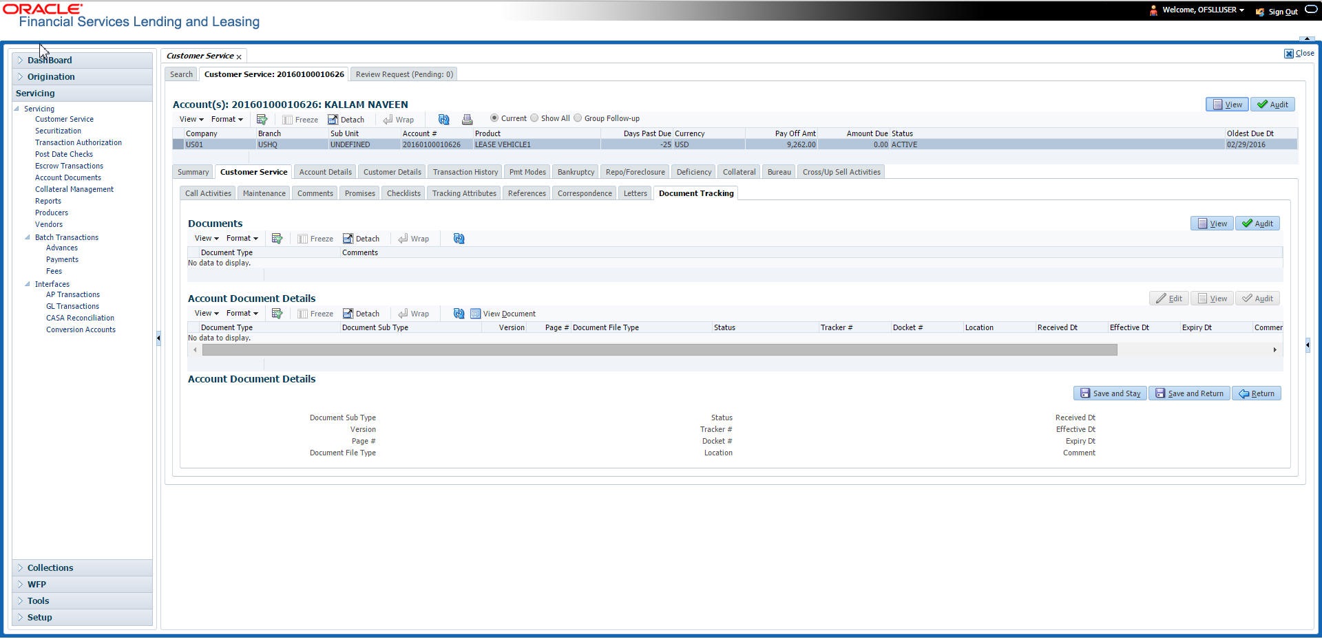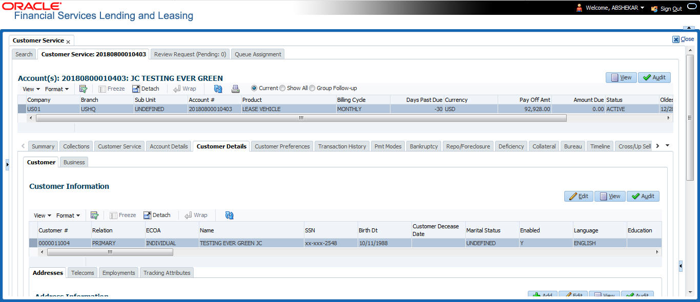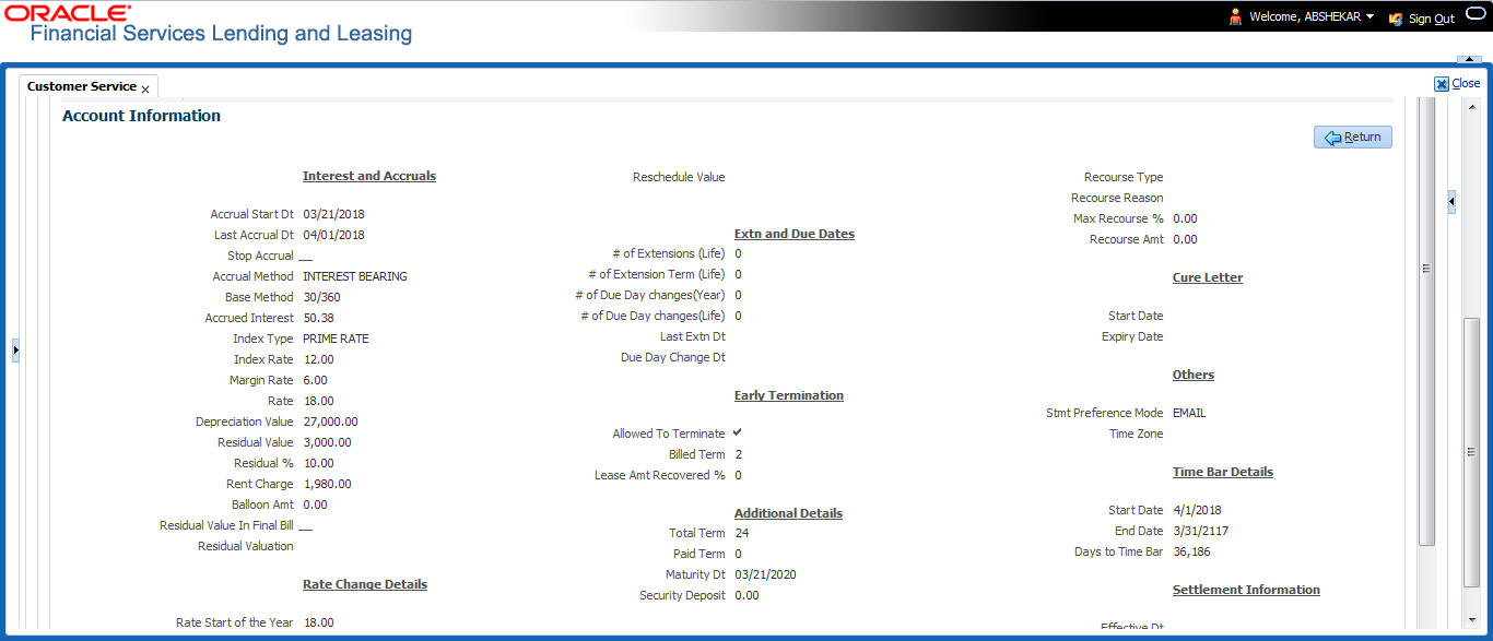 After an application has cycled through the Lease origination process, it becomes an account. Account maintenance and collections tasks can be performed with Oracle Financial Services Lending and Leasing’s Customer Service screen.