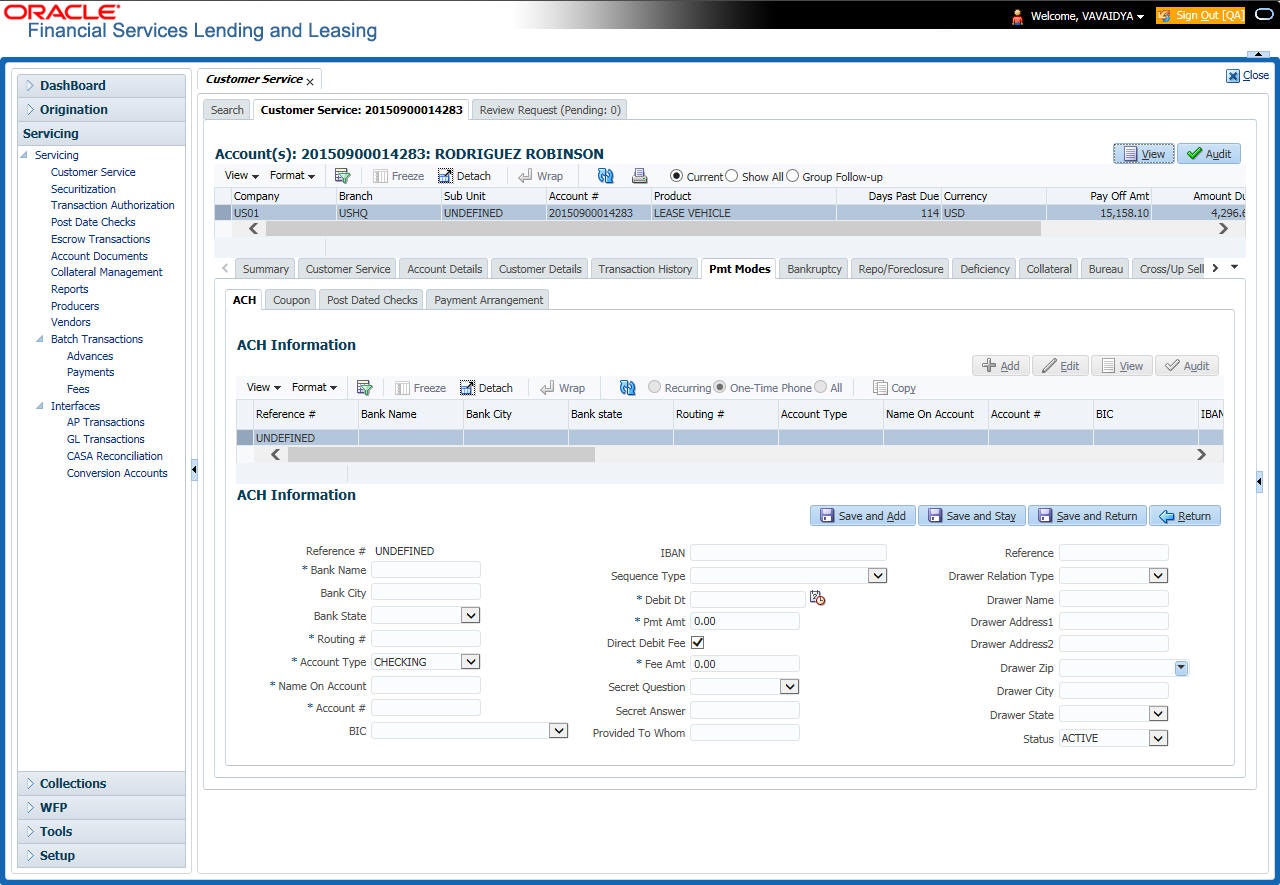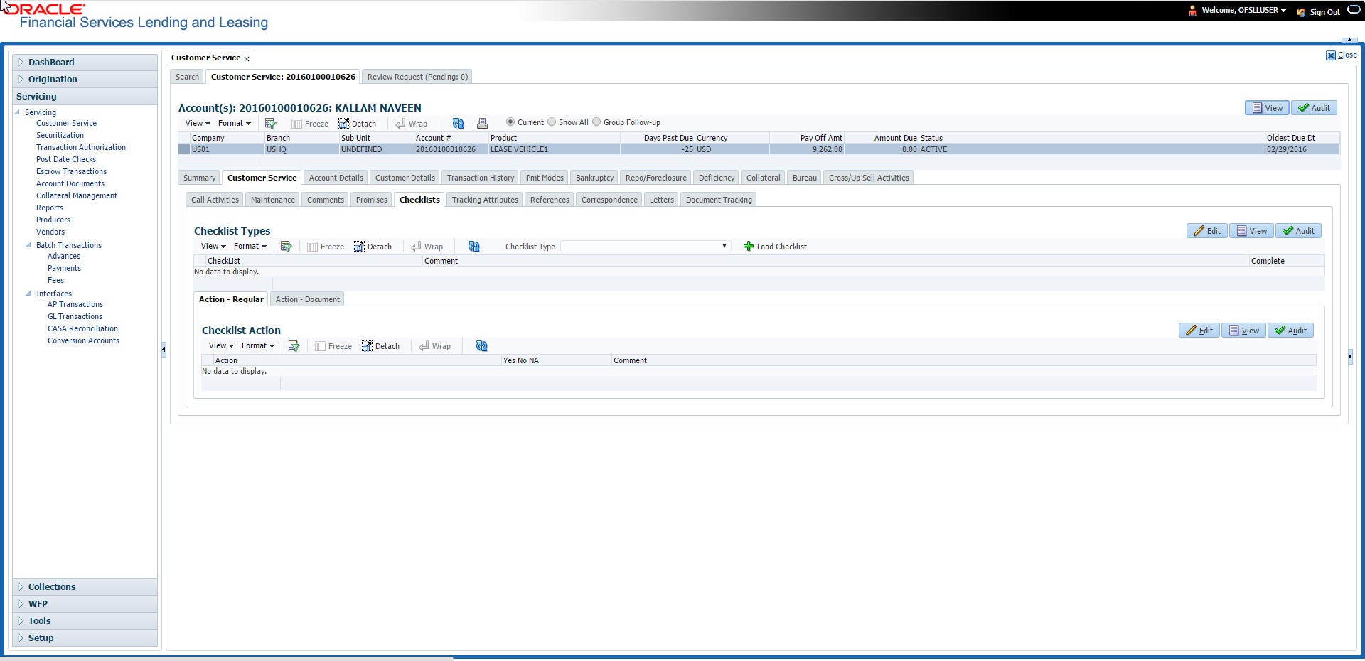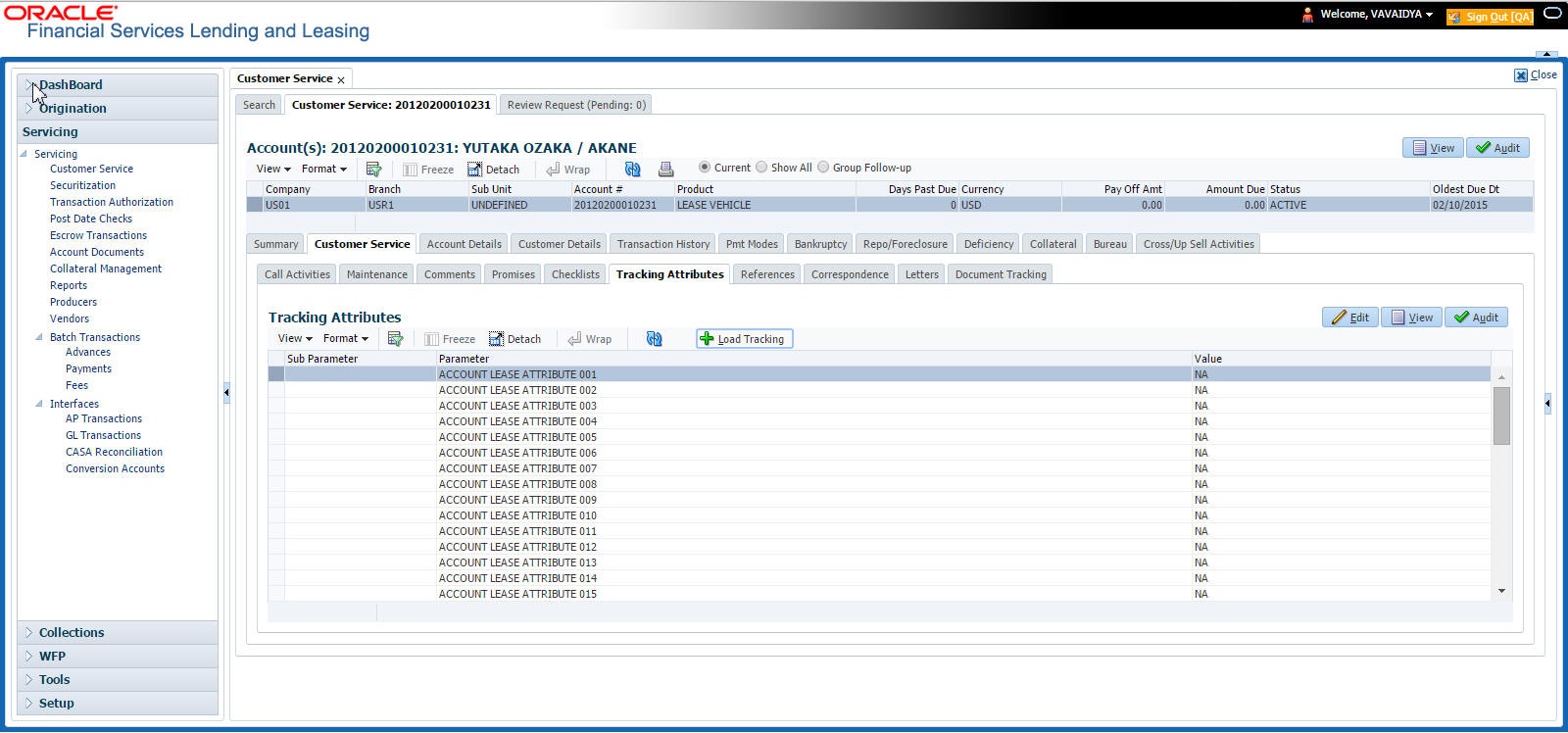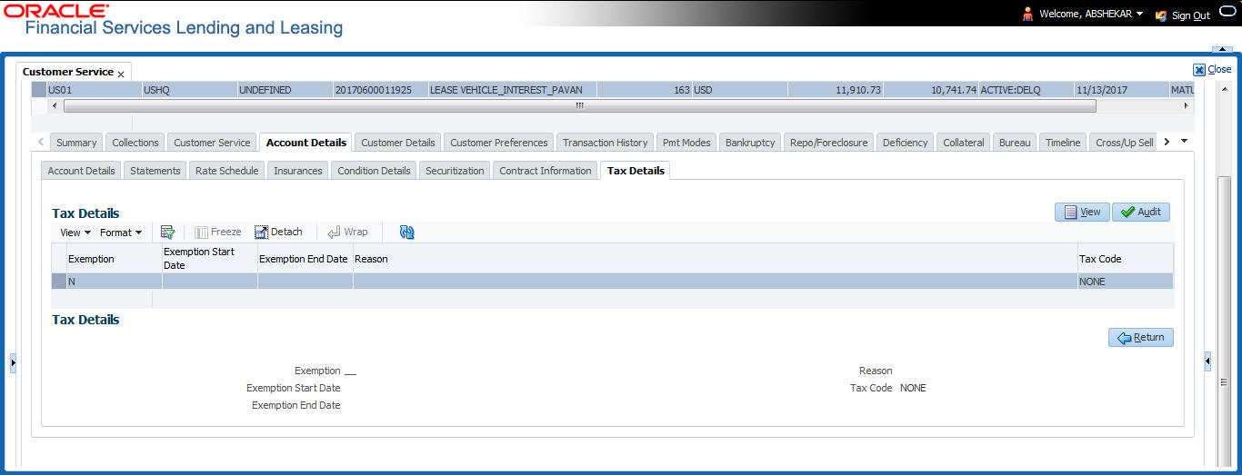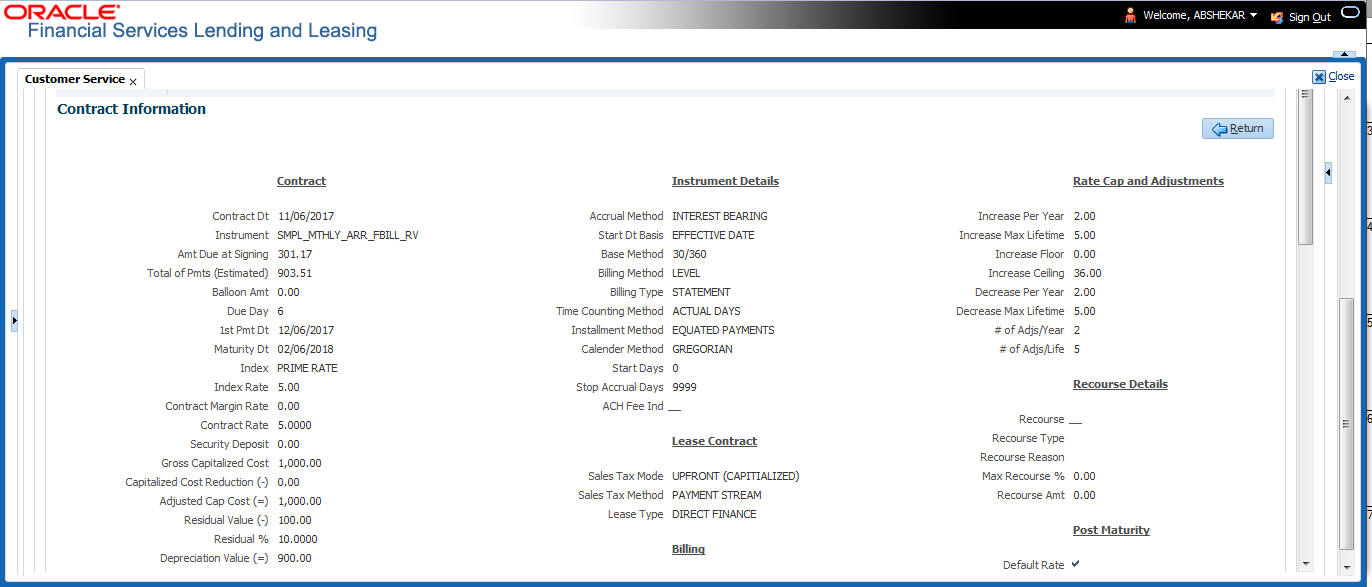 After an application has cycled through the Lease origination process, it becomes an account. Account maintenance and collections tasks can be performed with Oracle Financial Services Lending and Leasing’s Customer Service screen.
