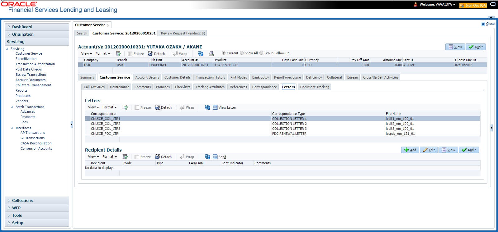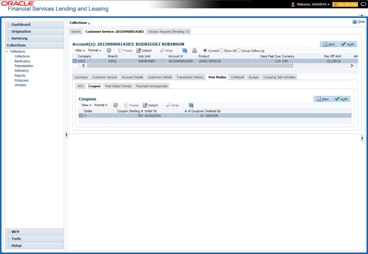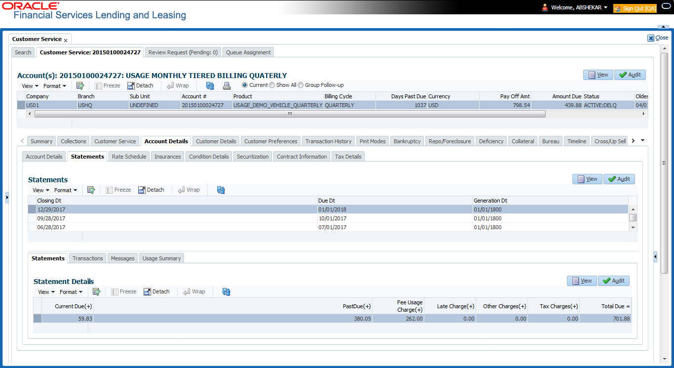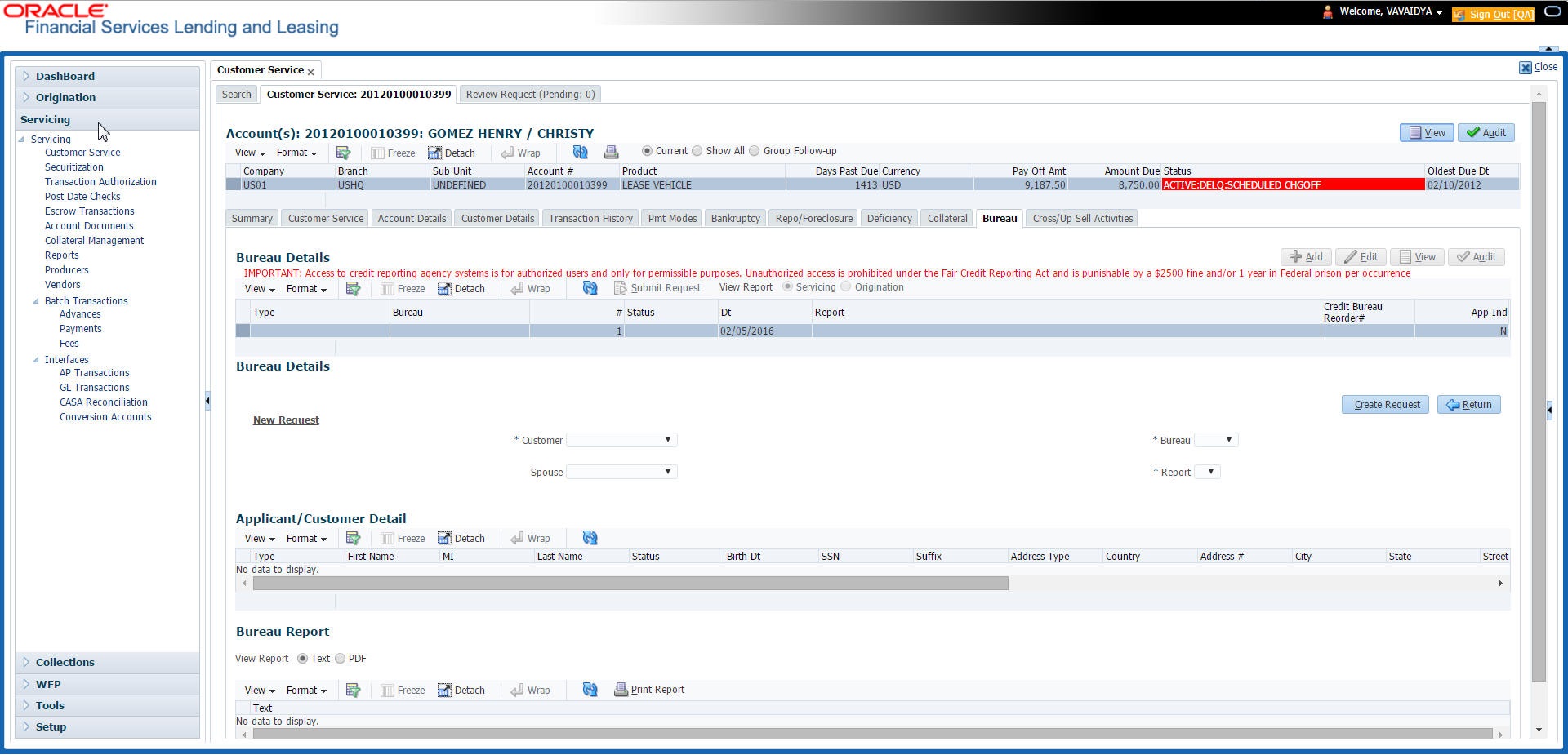 After an application has cycled through the Lease origination process, it becomes an account. Account maintenance and collections tasks can be performed with Oracle Financial Services Lending and Leasing’s Customer Service screen.
