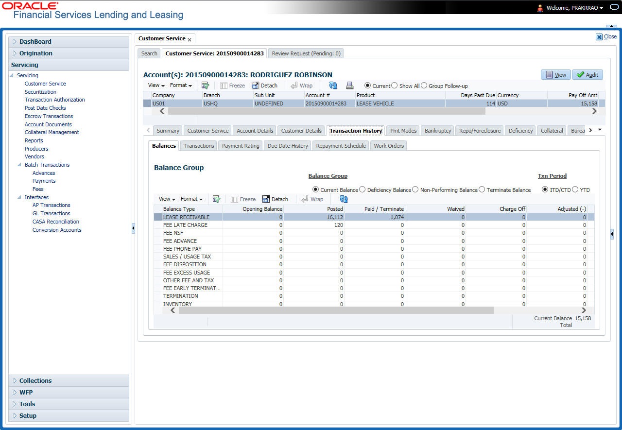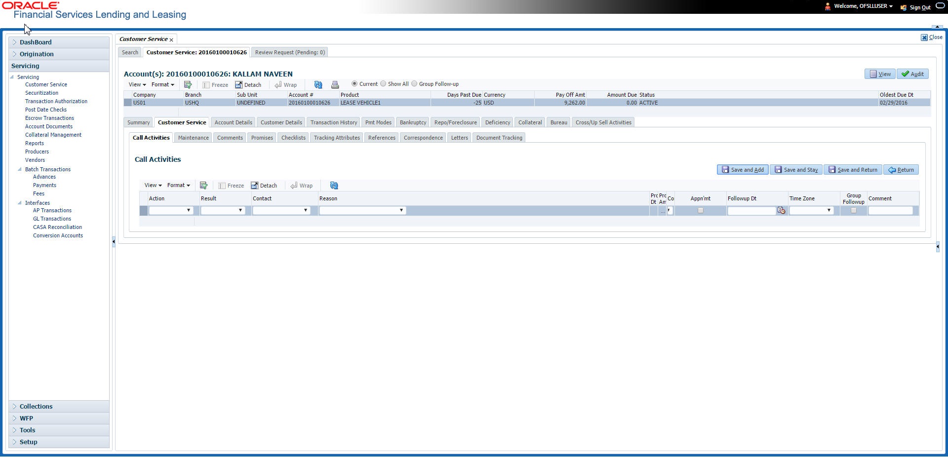 The Customer Service screen enables you to view and manage all customer information in a centralized location to ensure data integrity and provide better service. Oracle Financial Services Lending and Leasing provides online real-time information about the applicant(s), contract, account balances, dues, transactions, call activities, and comments. Oracle Financial Services Lending and Leasing also supports back-dating of financial transactions till the account’s opening date.