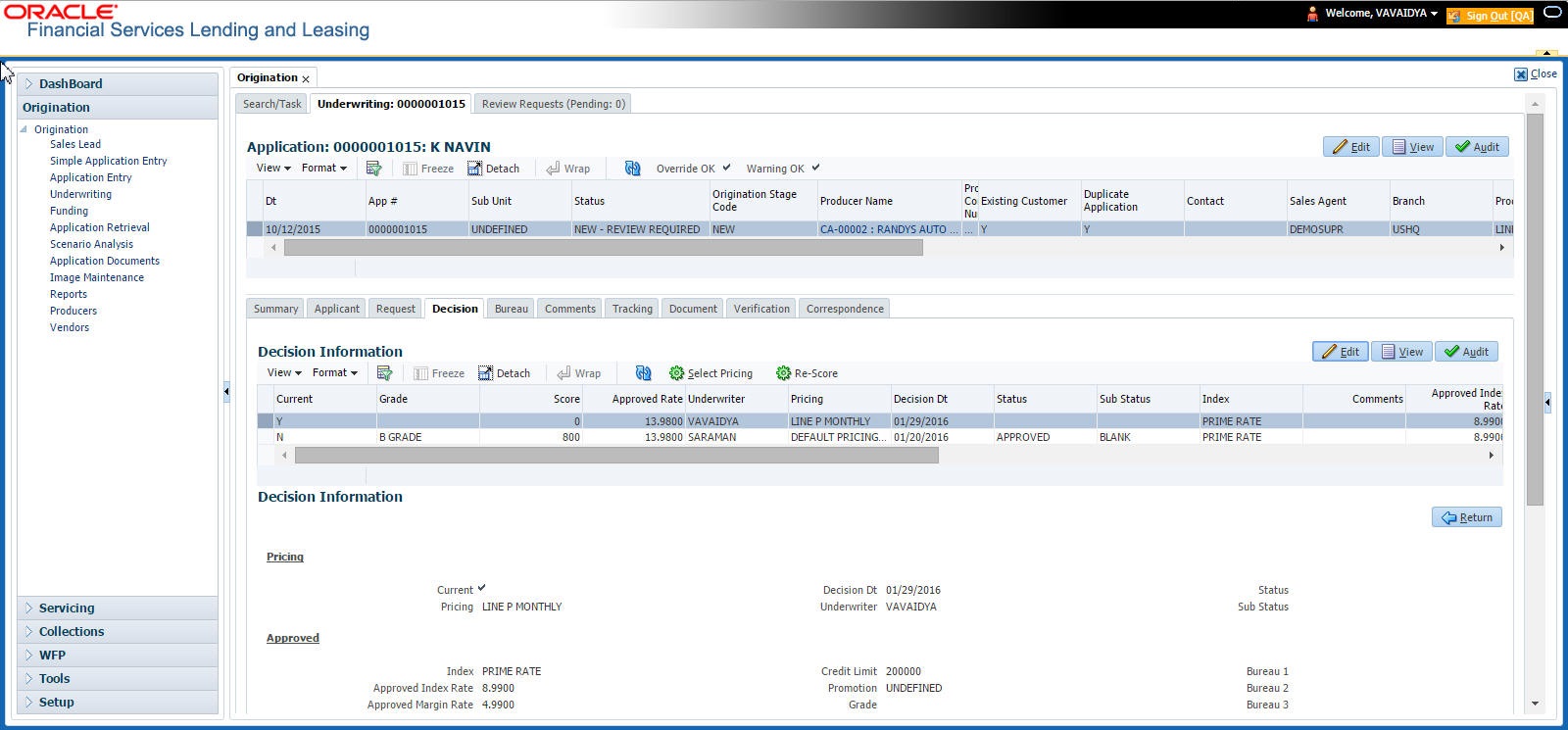 Decision details will be displayed when application has Origination Stage as “Review, Decisioned, Contract or Funded”. In case an application is Rehashed, only Decision information will be displayed and Contract information will not be displayed. Contract details will be displayed when application has Origination Stage as “Contract or Funded”.