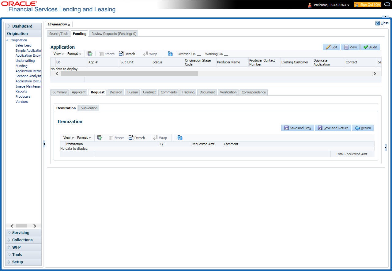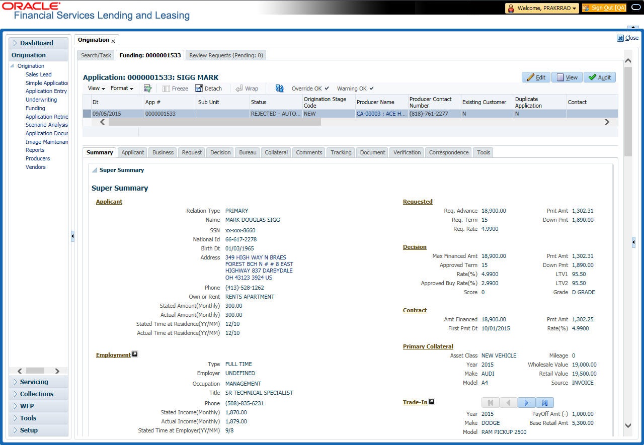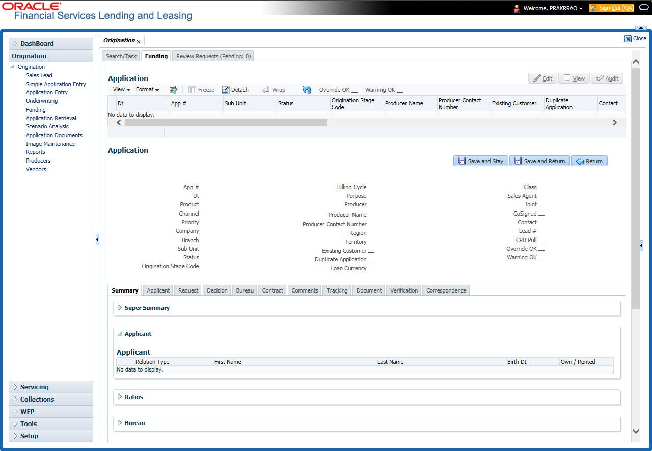 At this stage of the Loan origination process, the application has been entered into Oracle Financial Services Lending and Leasing and approved manually by an underwriter or by the system. The next step is to view and complete the contract information and make a funding decision to finance or reject the application. This is accomplished by using the Funding screen.