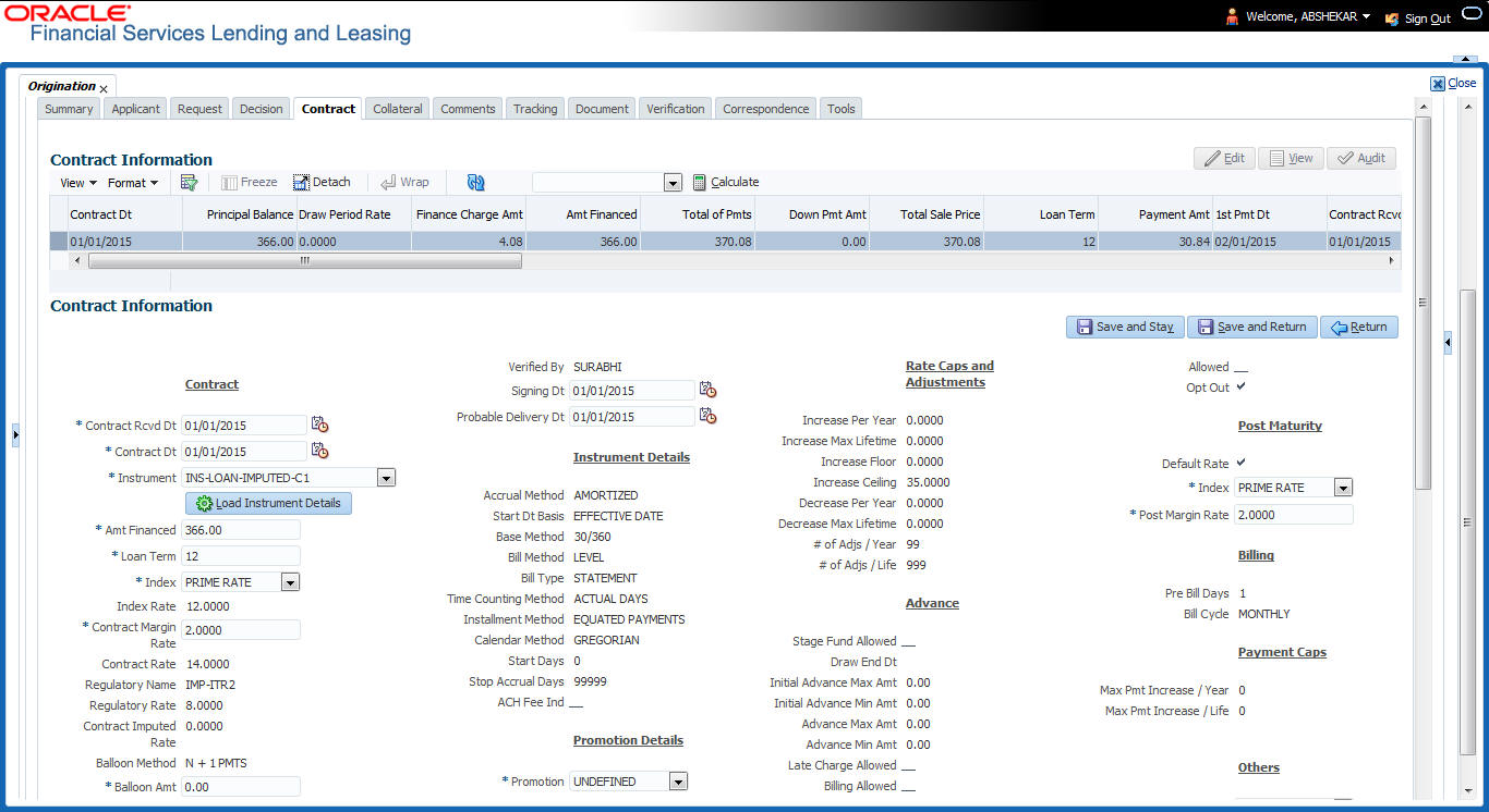 The screens associated with the Contract link are the core of the funding process. They allow you to perform the important task of completing the truth-in-lending details. These screens include information mandated by Regulation Z; information about the financed amount, the payment schedule, the total of these payments, the finance charge, the resulting annual percentage rate (calculated according to Federal/Central bank guidelines; that is, within 125% of the Treasury OCC calculated APR) for the conventional Loan, and internal rate of return for Islamic Loan. Use the Loan packet to supply the required information.