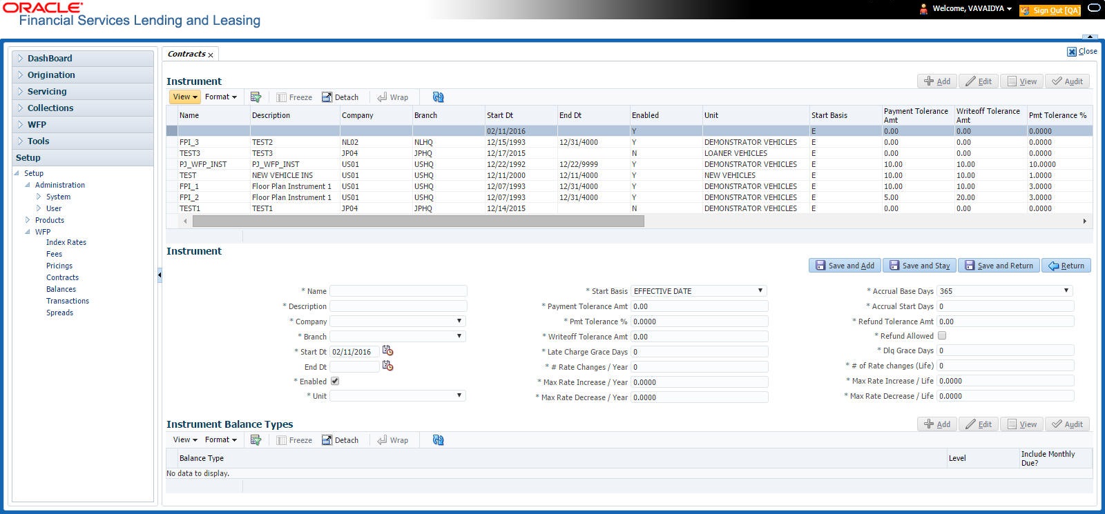 On the Oracle Financial Services Lending and Leasing home screen, click Setup > Setup > WFP > Contracts
