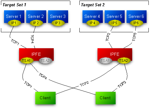 The IPFE acts as a specialized layer-3 router. The various servers to which the IPFE routes packets are divided into up to 16 groups, called Target Sets. Each of the target sets are assigned a shared Target Set Address, a publicly exposed service address.