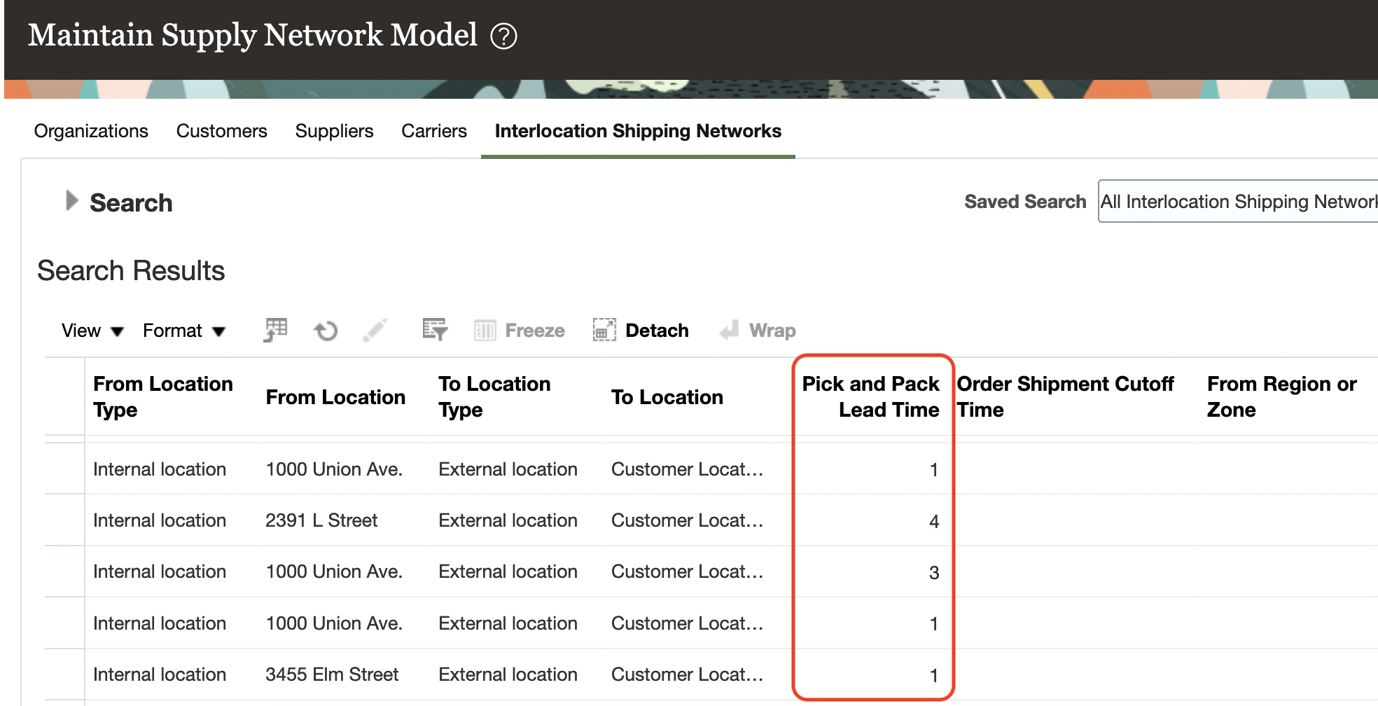 Oracle Global Order Promisingでは通常、履行事業所で供給が使用可能になる日にオーダー明細が出荷されるようにスケジュールされます。履行が遅延するのは、ネットワーク・モデルの「オーダー出荷期限時間」属性の値の後に、出荷する必要がある同じ日に有効数量チェックまたはスケジューリング要求を受け取った場合のみです。出荷前に、品目の梱包とラベリング、輸送の手配、または品質チェックを行うためにより多くの時間が必要になる場合があります。これらのアクティビティに追加のピックおよび梱包のリード・タイムを追加できるようになりました。また、履行組織、運送業者および搬送先に応じてその時間を調整できます。指定するリード・タイムは、各オーダー明細の約束出荷日および約束搬送日を相殺します。