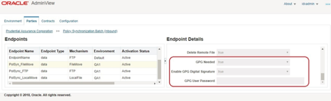 Admin view application at the Parties Endpoint page, select the gpg needed has true and give the gpg password of host private key and check the Enable digital signature check box. (This setting is used to decrypt the payload xml which has encrypted with the public key).