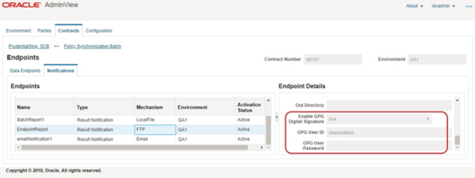 Admin view application at the Notification Endpoint page, check the Enable digital signature check box and enter host private key user id and password. (This setting is used to sign the notification report xml file which needs to send).