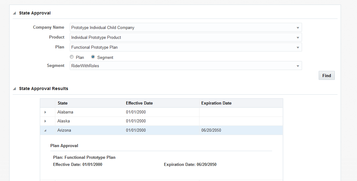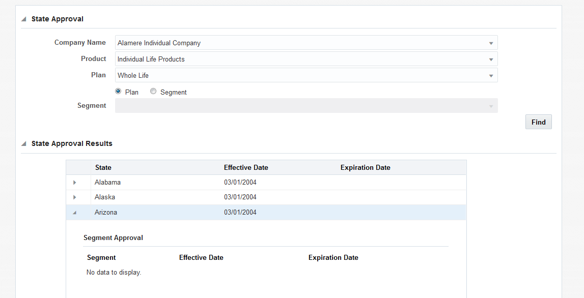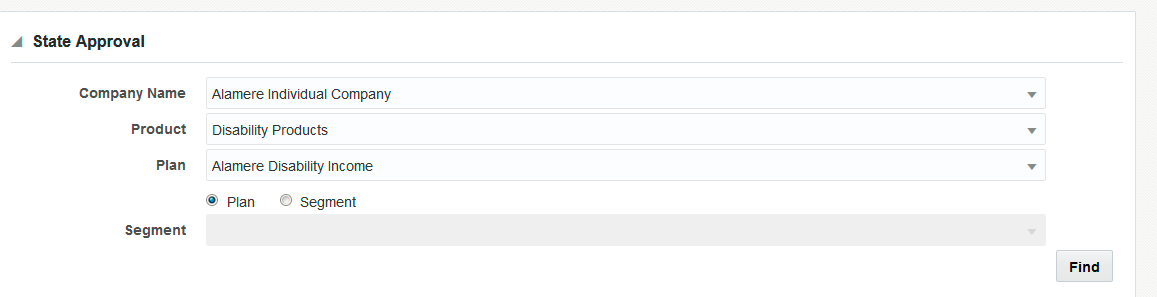 State Approval records are filtered by Company, Product and Plan. Once the initial information is entered, a radio button is provided to select the type of state approval records to display: plan or segment records. If the Segment radio button is selected, then the Segment drop down box will be populated with the available segments. Click the Find button to populate the State Approval Results section with the results of the search.