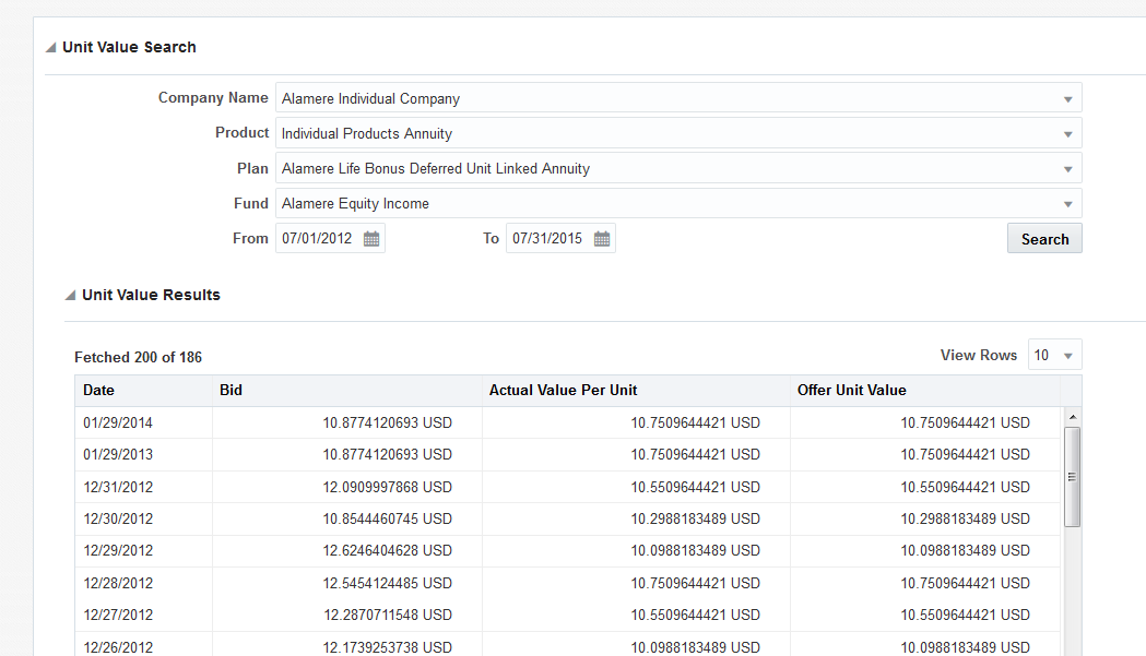 The Unit Value screen displays the unit values for a specific fund over a defined course of time. When the Unit Value option is clicked, The Unit Value Search section is displayed. You can fill in the following fields to search for Unit Value Results.