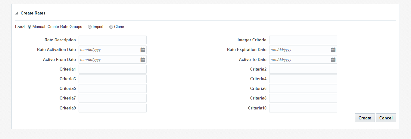 This option is selected by default to create rate groups. There are various fields on the Create Rates pane like Rate Description, Integer Criteria, Rate Activation Date, Rate Expiration Date, Active From Date, Active To Date, and Criteria1 through Criteria10.