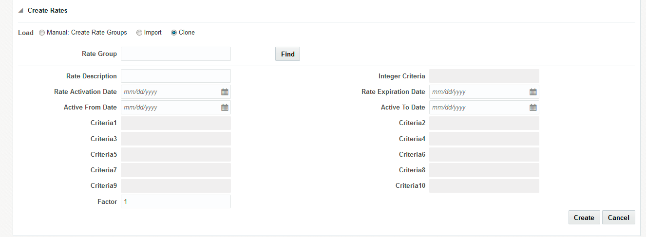 Clicking on Create will create the new Rate Group with the rates multiplied with the Factor. It will also validate to check for any duplicate existing records for Rate Group description and the Effective Date and display "Rate Group Name already exists for this Effective Date" error message. It also validates all the dated versions of the same rate group (description) should have the same integer criteria and the same criteria 1 through 10.
