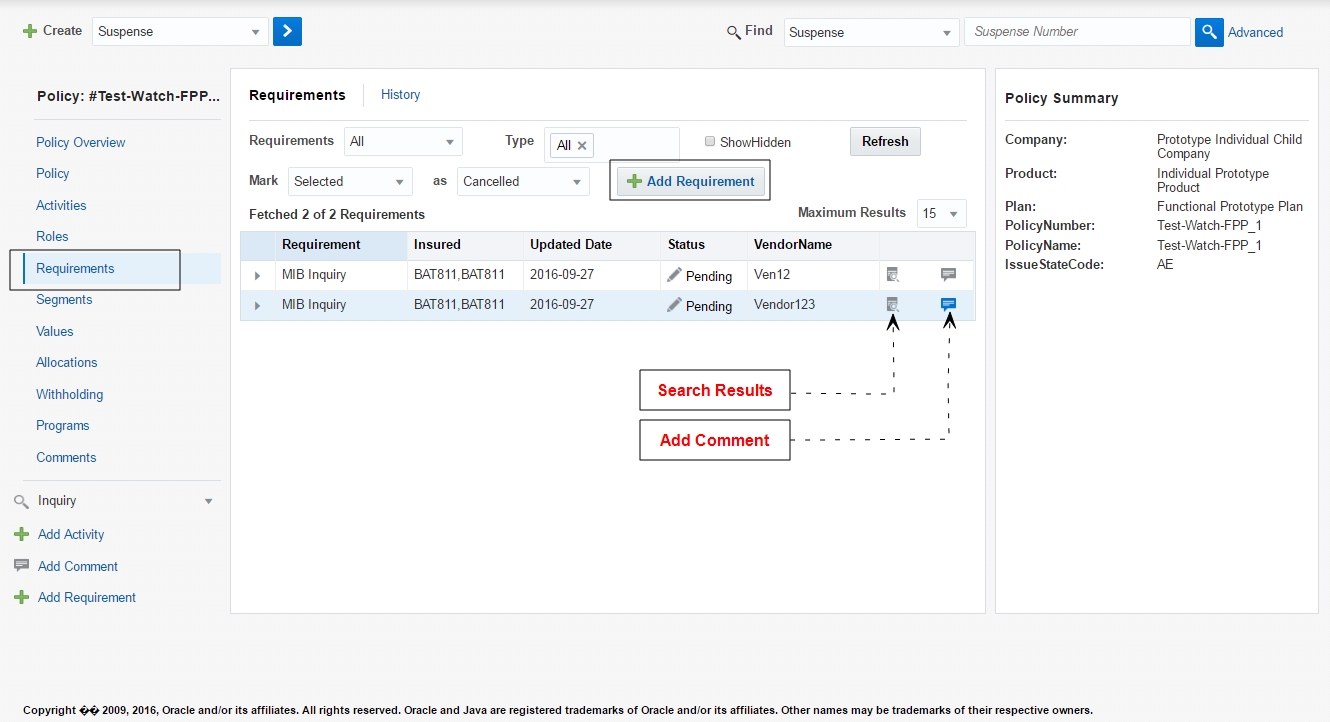 Requirements are the items that need to be fulfilled before an application is approved or underwriter takes a decision on a case or Policy in OIPA. The Requirement Screen summarizes all the requirements and the results associated with these requirements. Requirements can be added under a policy and can be attached to an activity to set conditions around when the activity may process.