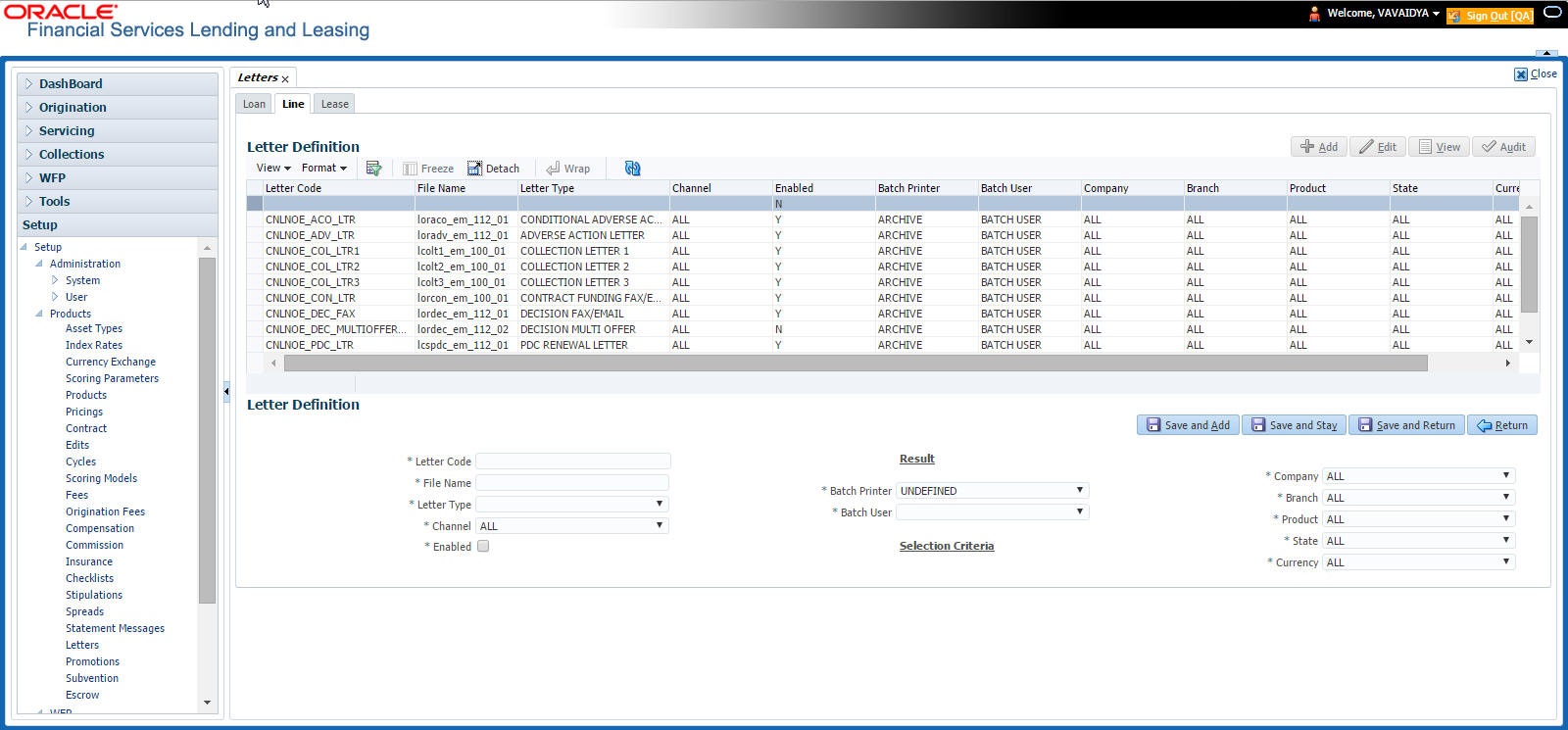 The Letters screen allows you to define letters that the system automatically generates when the application or the account for a products meets certain conditions, or “trigger events.” Each letter has its own trigger event. For example, you can configure the system to automatically send a welcome letter when an application becomes an account or send a collection letters when an account becomes delinquent.