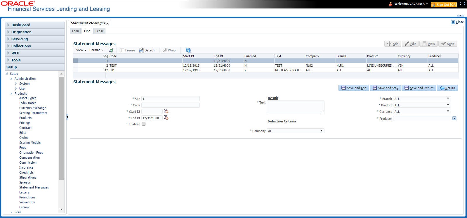 Select the producer for the statement message from the drop-down list. This may be ALL or a specific producer. The available values come from a validated field based on the Pro Group and Pro Type. IMPORTANT: By selecting which message to use, the system searches for a best match using the following attributes: 1. Company 2. Branch 3. Product 4. Producer 5. Currency Hence, Oracle Financial Services Software recommends creating one version of each edit type where ALL is the value in these fields. |