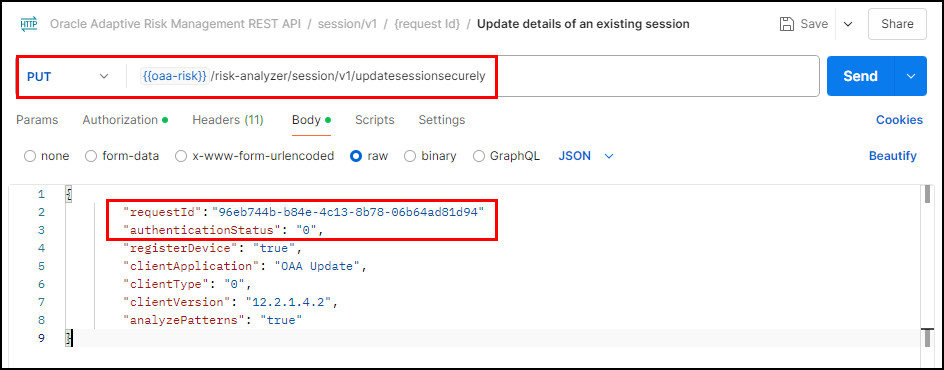 . On the Postman Collections tab, navigate to Oracle Adaptive Risk Management REST API > session/v1 > (request id). Select Update details of an existing session.Replace the following values in the Body of the API call, and click Send:
