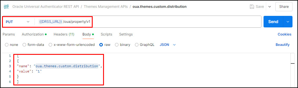 2. Select PUT oua.themes.custom.distribution. This request makes a PUT request to the oaa-drss/oua/property/v1 endpoint, by setting the oua.themes.custom.distribution property in the body. A value of 1 activates themes, and a value of 0 deactivates the themes. The default value is 0.