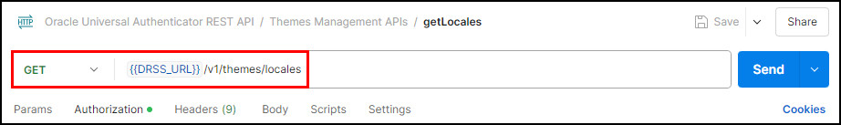 2. Select GET getLocale. This request makes a GET request to the oaa-drss/v1/themes/locales endpoint, and returns all the themes created.