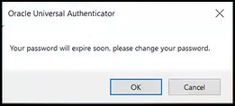 In this example, the user has previously logged into Windows with Oracle Universal Authenticator. On a subsequent login, the user enters their OAM username and password and receives a message saying their password is due to expire.