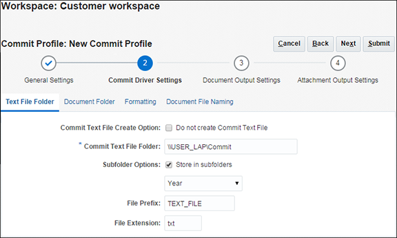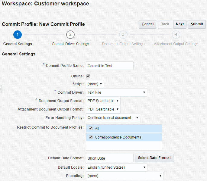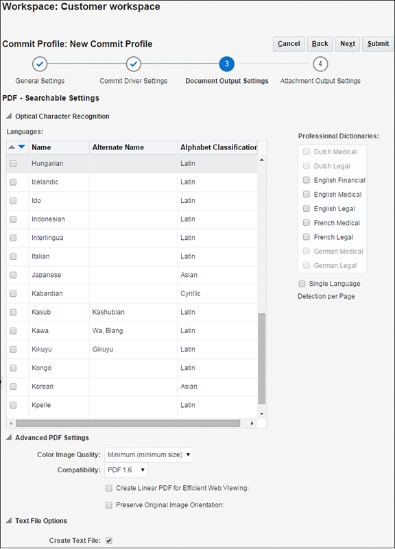 必要に応じて、ステップ2.aおよび2.bを実行します(「PDF検索可能ドキュメント出力の構成」を参照)。「送信」をクリックし、コミット・プロファイルを保存します。