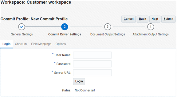 「ログイン」タブで、ドキュメント・コミット時にOracle Content Managementサーバー・インスタンスにログインするためのユーザー名、パスワード、サーバーURLを入力します。
