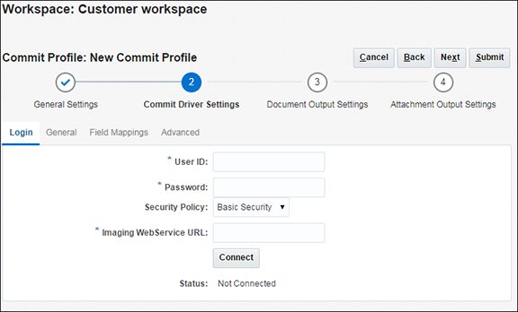 「一般設定」トレイン・ストップの「コミット・ドライバ」フィールドで「Oracle Content Management」を選択します。