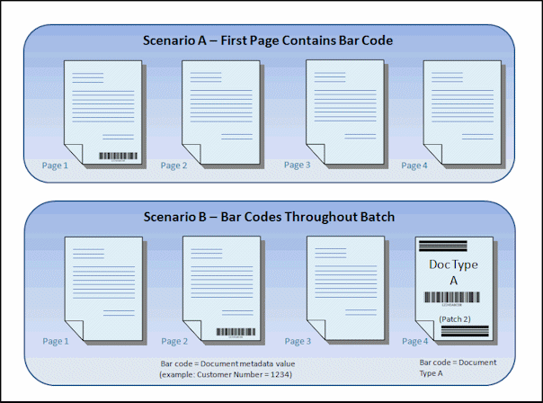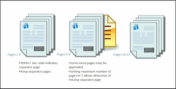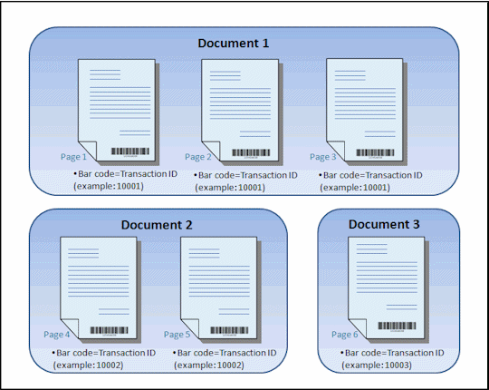 ドキュメントの各ページに同じバー・コード値を含むことを指定する場合は、区切りに使用するバー・コード定義を指定する必要があります。ジョブが異なるバー・コードを持つバー・コード定義を検出する場合は、新しいドキュメントが作成されます。セパレータは必要ありません。