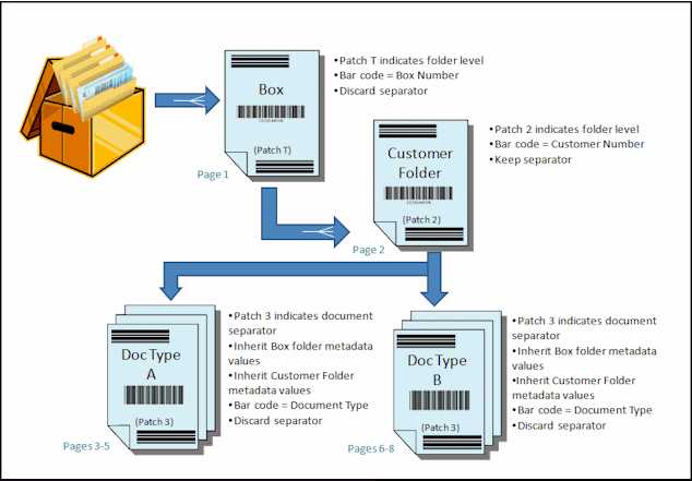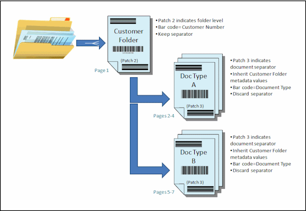 「ドキュメントの分割方法」で説明されているように、階層セパレータを使用してドキュメントを編成することを選択する場合は、パッチ・コードまたはバー・コード(あるいはその両方)、または空白ページを検出する階層レベルごとにセパレータ・ページ定義を構成する必要があります。(単一レベル・セパレータ・ジョブまたは編成を必要としないジョブ用にドキュメント分割を構成するには、「セパレータ・ページ定義の構成」を参照してください。)