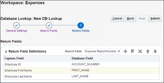 「戻りフィールド定義」表の見出しの「検索フィールド」オプションでExpense Report Numberが自動的に選択されることに注意してください。
