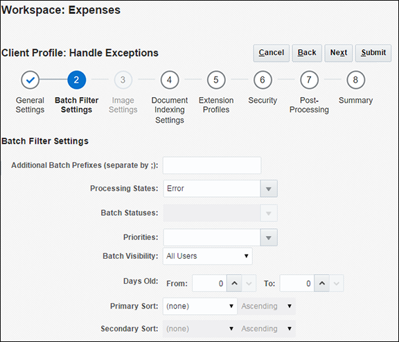 ##### 図10-17 エラー・バッチのみを表示するための例外クライアント・プロファイルの構成