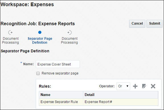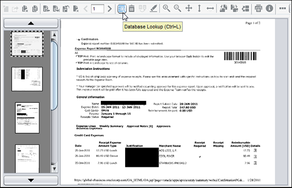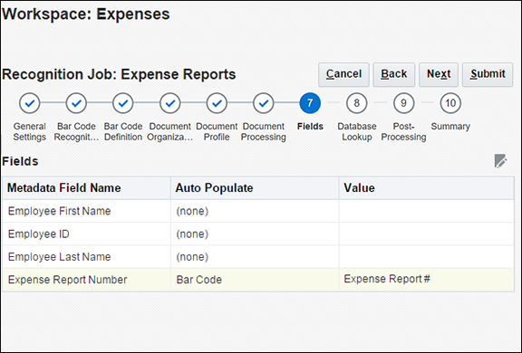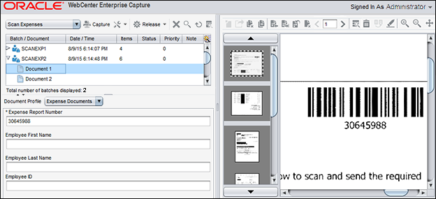 認識プロセッサ・ジョブにより、「タスク8: 認識処理の構成」で構成したページ・セパレータに基づいて、単一のドキュメントが個別のドキュメントに分割されます。さらに、構成したとおり、ジョブによってExpense Report Numberメタデータ・フィールドに読み取られたバー・コード値が移入されます。そして、ジョブでは、データベース参照が実行され、データベース参照の戻りフィールドを使用して残りのメタデータ・フィールドに移入されます(構成した場合)。