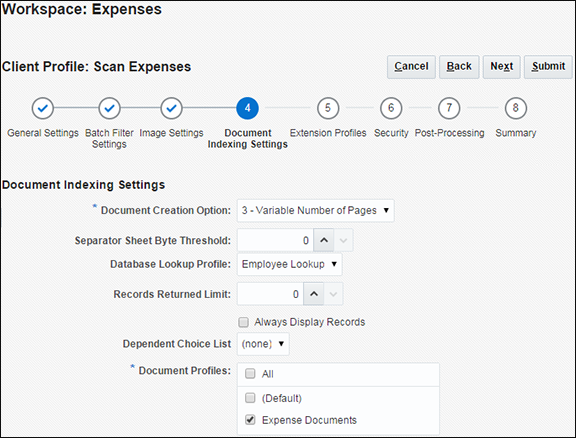 「ドキュメント索引付け設定」トレイン・ストップの「ドキュメント・プロファイル」フィールドで、Expense Documentsプロファイルを選択します。