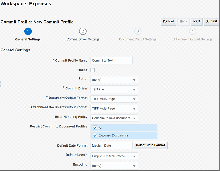 バー・コード付きの経費レポートをCaptureにスキャンまたはインポートし、索引を付け、ワークフロー処理のためにコミットするように、経費処理のユースケースを構成できます。