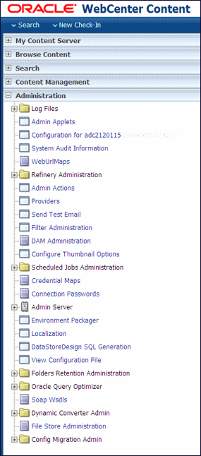 構成マネージャ、リポジトリ・マネージャ、Webレイアウト・エディタ、ワークフロー管理の各アプリケーションの詳細は、『Oracle WebCenter Contentのマネージメント』の管理ツールの理解に関する項を参照してください。