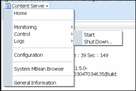 Fusion Middleware ControlにアクセスしてWebCenter Contentを管理する方法の詳細は、「Fusion Middleware Controlを使用したWebCenter Contentへのアクセス」を参照してください。Fusion Middleware Controlにアクセスして使用する方法の詳細は、『Oracle Fusion Middlewareの管理』のOracle Enterprise Manager Fusion Middleware Controlのスタート・ガイドに関する項を参照してください。