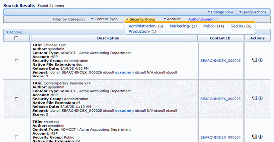 これは、多くのアイテムを返す問合せの場合に役に立ちます。たとえば、結果セットに、「Public」セキュリティ・グループに属する100のドキュメント、「Sales」グループに属する75のドキュメント、および「Marketing」グループに属する25のドキュメントを含む、200のコンテンツ・アイテムが含まれているとします。「セキュリティ・グループ」のメニュー・オプションには、値リストと、各値に属するドキュメント数が表示されます。メニューから値(「Public」、「Sales」、「Marketing」)の1つを選択すると、その値に属するドキュメントのみが結果セットのリストに示されます。