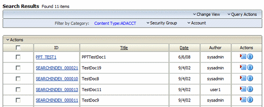コンテンツ・サーバーでは、Oracle Text検索機能を使用して、検索結果リストについての追加情報を取得し、「検索結果」ページの新しいメニュー・バーに表示しますこの情報には、特定の情報フィールドの特定の値にどれだけのドキュメントが添付されているかが要約されています。コンテンツ・サーバーでは、最大4つの情報フィールドのクラスタリングがサポートされています(デフォルトのフィールドは、「セキュリティ・グループ」と「ドキュメント・タイプ」)。