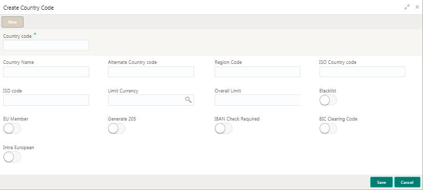 ● Generate 205: By default, this is disabled. If enabled, indicates the cover message 205COV or 205 need to be generated for transactions involving this country. If you do not select this option, RTGS, 202 or 202COV message is generated.
