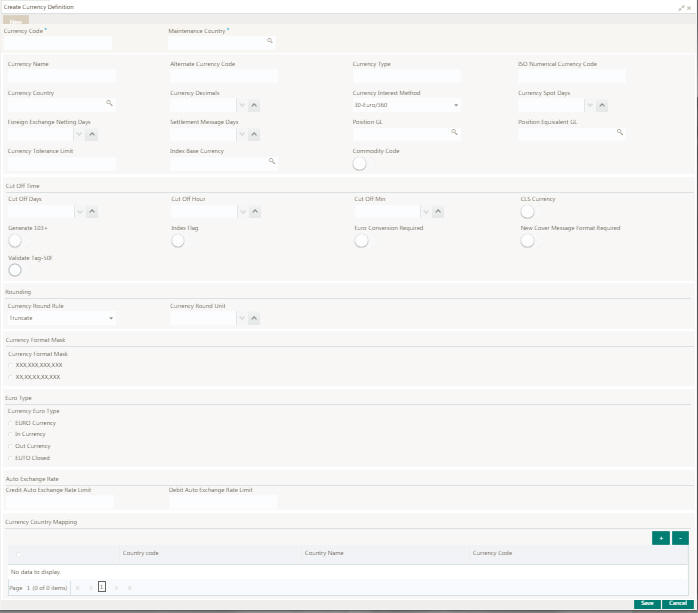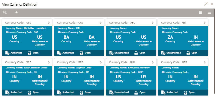 Currencies can be maintained only at the Head Office. The list of currencies are available to the branches based on the currencies defined for the country linked to the branch.