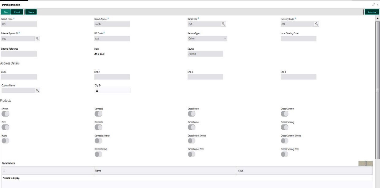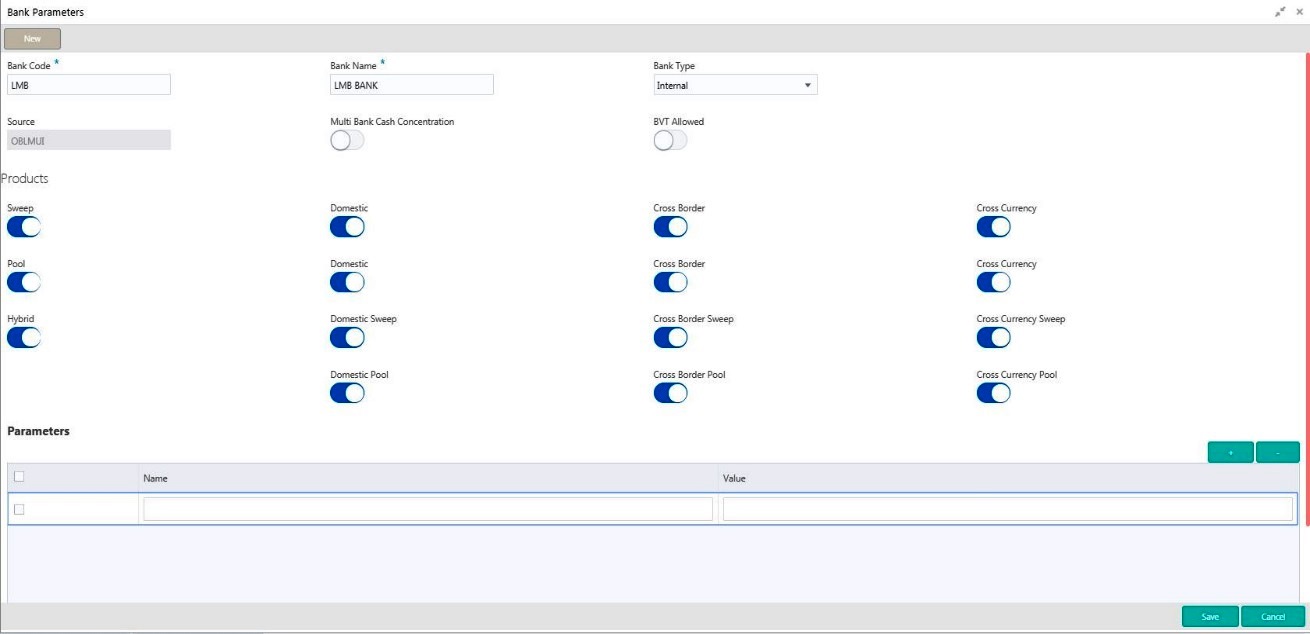 You can maintain payment parameter values at bank level for all the internal and external banks participating in liquidity management structure. The values captured in this screen will be handed off to payment systems to initiate domestic or cross border sweep.