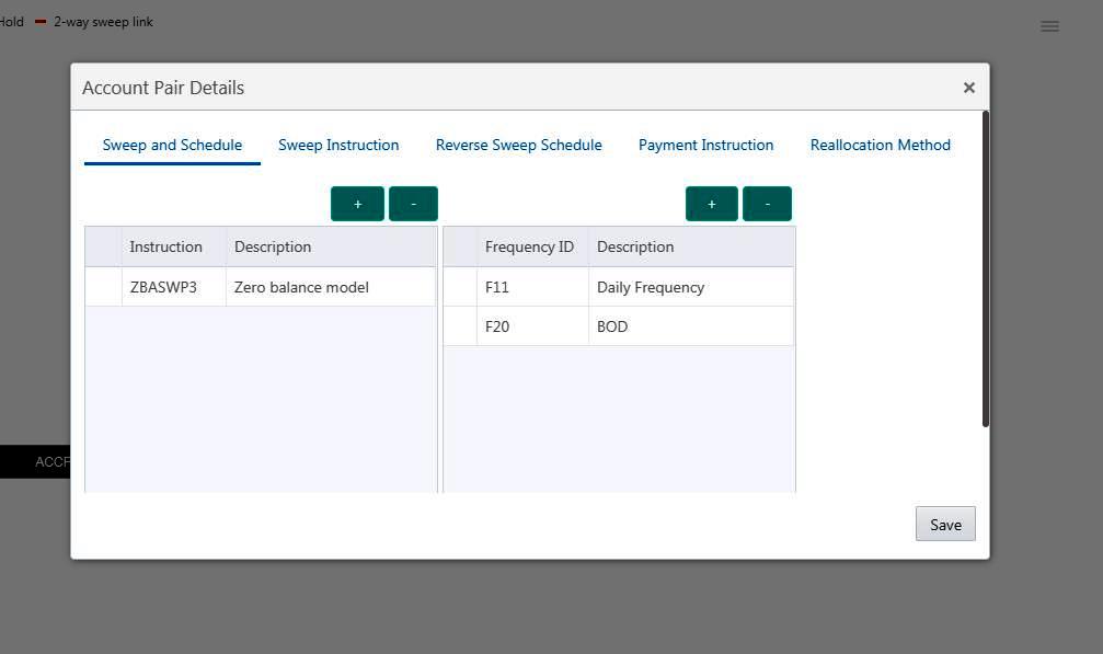 Reverse sweep frequency is the frequency at which the swept funds are remitted back to remitter account. Specify the frequency of reverse sweep. You can select the frequency from the option list. The list displays all the frequencies maintained in the system.