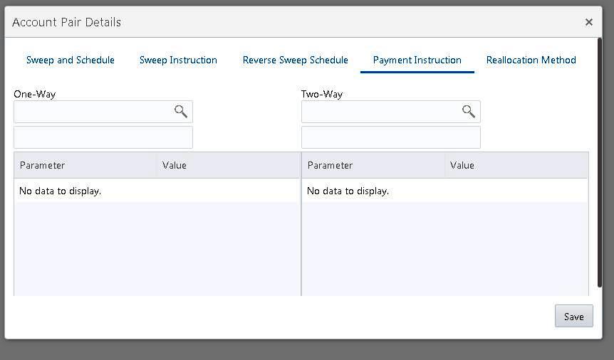 If the account pair is set for one way, only one way parameter can be viewed on screen. Else both one way and two way options can be viewed. Select the one way and two way parameters from the drop down list. The list displays all the parameters that are set for the account in payment parameters setup.