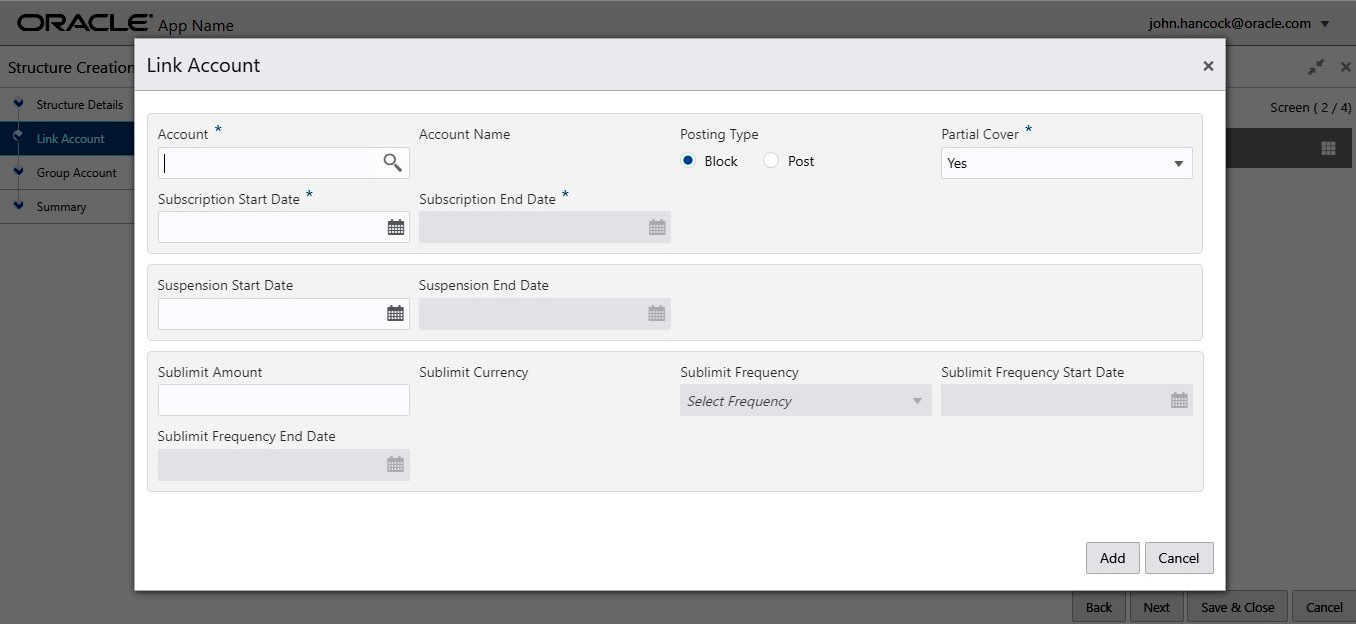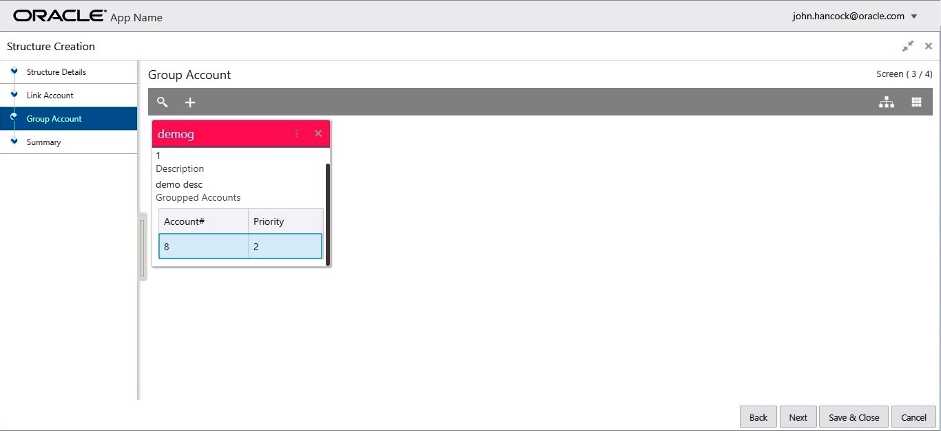 On the left side of this screen, there is a list of accounts; which are added to the structure. The user can select the account to be added into the group.