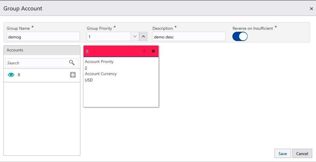 While adding the account into the group, the priority of the account (within the group) can be specified. Once the account is added into the group, the same cannot be added in the same or any other group again within that structure.