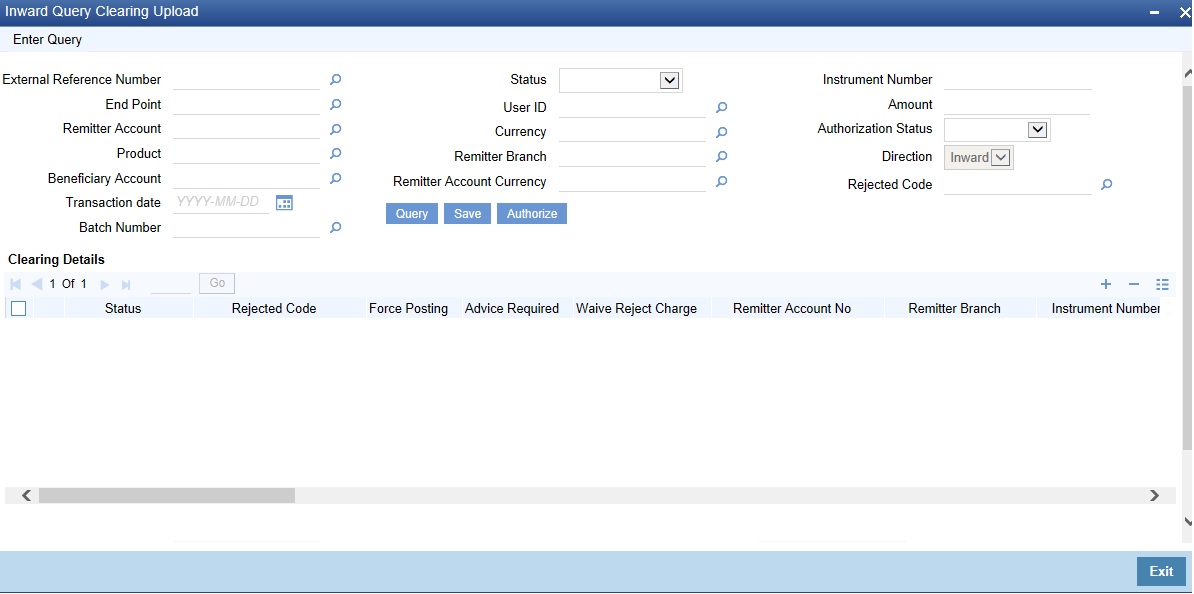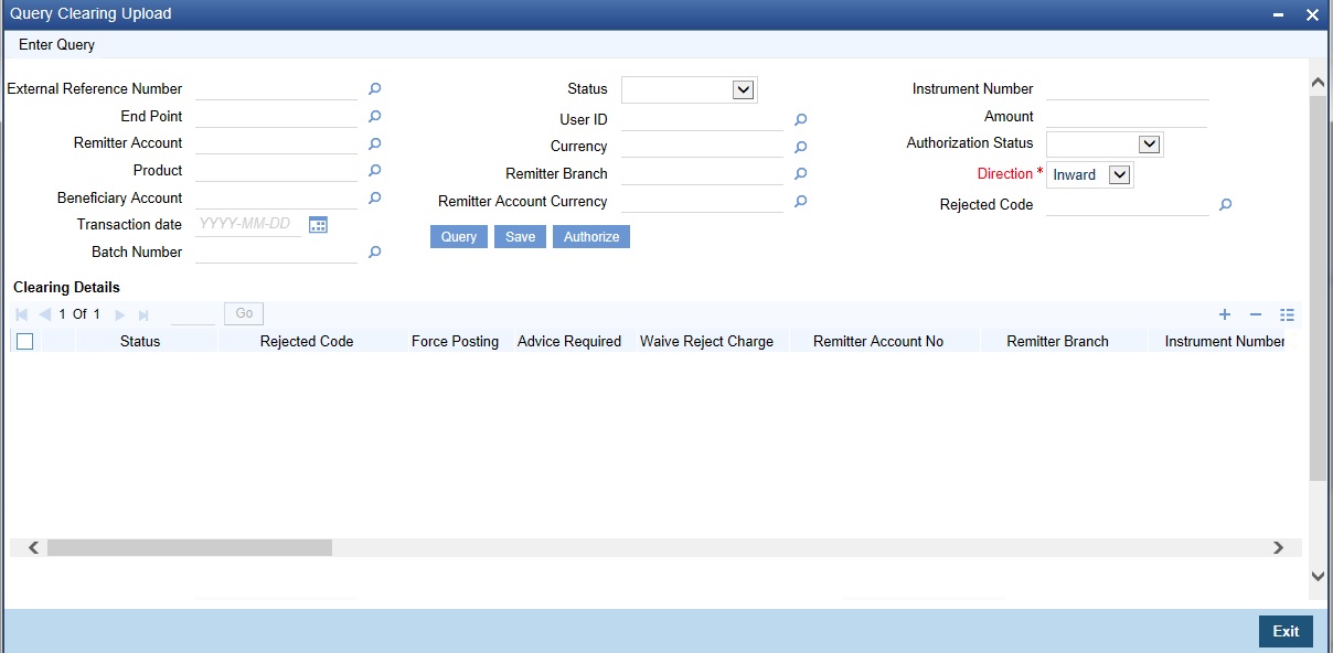 You can process the failed inward clearing transactions of instruments using ‘Query Clearing Upload’ screen. You can invoke this screen by typing ‘CGDCLGDT’ in the field at the top right corner of the Application tool bar and clicking on the adjoining arrow button.