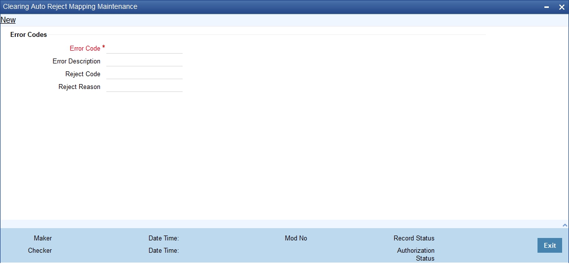 You can map Oracle FLEXCUBE error codes to the corresponding Reject codes that will result in the auto reject of the incoming clearing transaction using ‘Clearing Auto Reject Mapping Maintenance’ screen. You can invoke this screen by typing ‘CGDERRCD’ in the field at the top right corner of the Application tool bar and clicking on the adjoining arrow button.