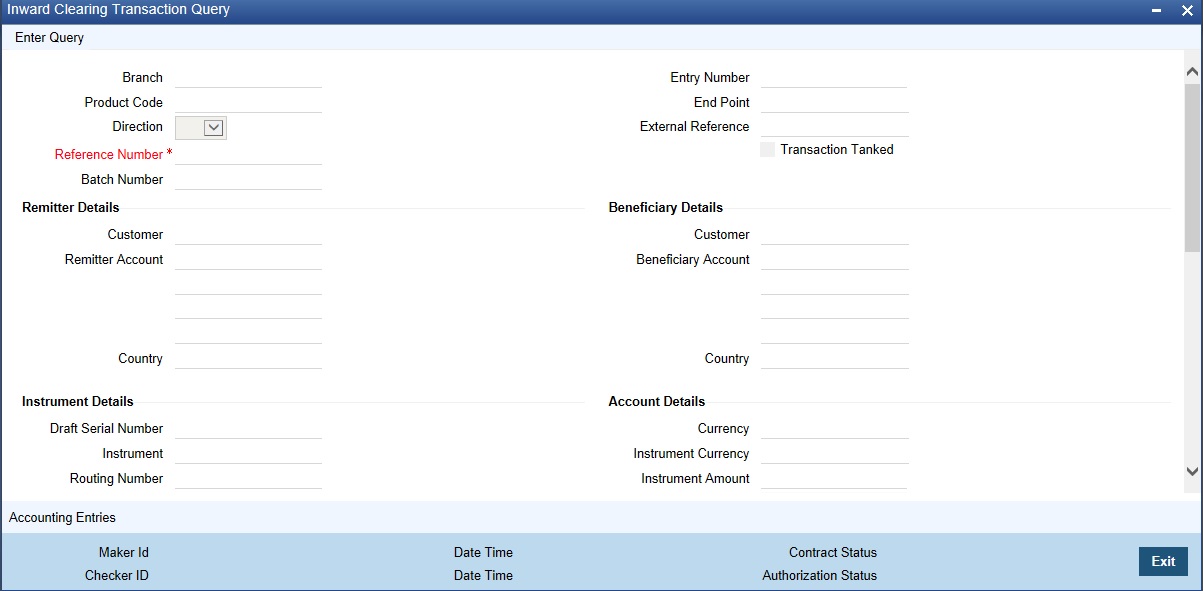 You can view inward clearing transactions in the ‘Inward Clearing Transaction Query’ screen, where you provide the details of the check instruments as well as the clearing details. You can invoke this screen by typing ‘CGDIWQRY’ in the field at the top right corner of the Application tool bar and clicking on the adjoining arrow button.